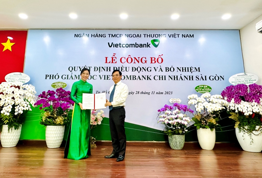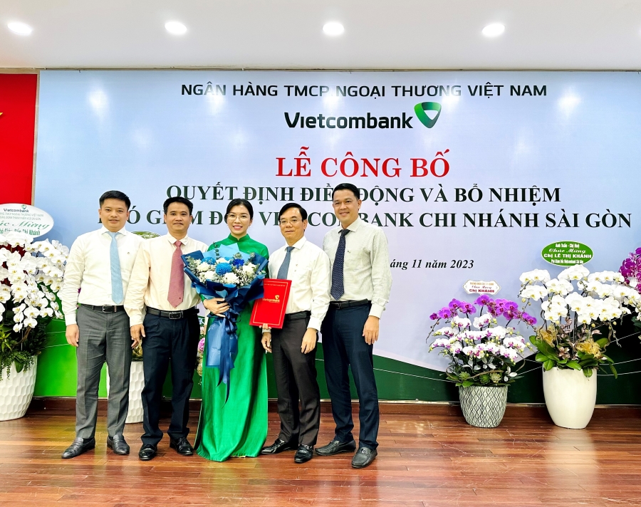 Tại buổi lễ, Vietcombank đã công bố quyết định về việc điều động, bổ nhiệm cán bộ. Theo đó tại quyết định số 2686/QĐ-VCB-TCNS ngày 24/11/2023, Tổng Giám đốc đã quyết định điều động, bổ nhiệm bà Lê Thị Khánh - Trưởng phòng giao dịch Trần Quốc Toản - Vietcombank Tân Định giữ chức vụ Phó Giám đốc Vietcombank Sài Gòn kể từ ngày 28/11/2023.