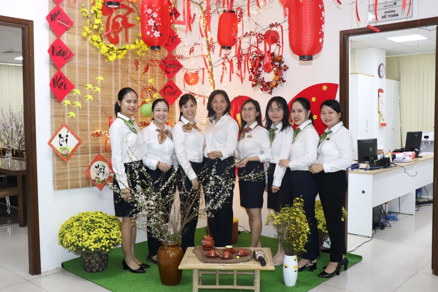 Cán bộ nhân viên trang trí và chụp ảnh lưu niệm tại phòng Kế toán