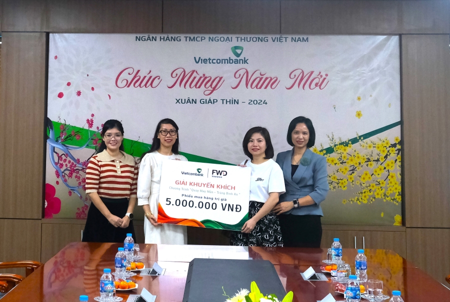 Sáng ngày 23/02/2024, tại trụ sở chi nhánh, Vietcombank Vĩnh Phúc đã phối hợp cùng Bảo hiểm FWD tổ chức chương trình trao thưởng cho 03 khách của chi nhánh tham gia bảo hiểm FWD và trúng thưởng chương trình “Quay may mắn - trúng bình an”.