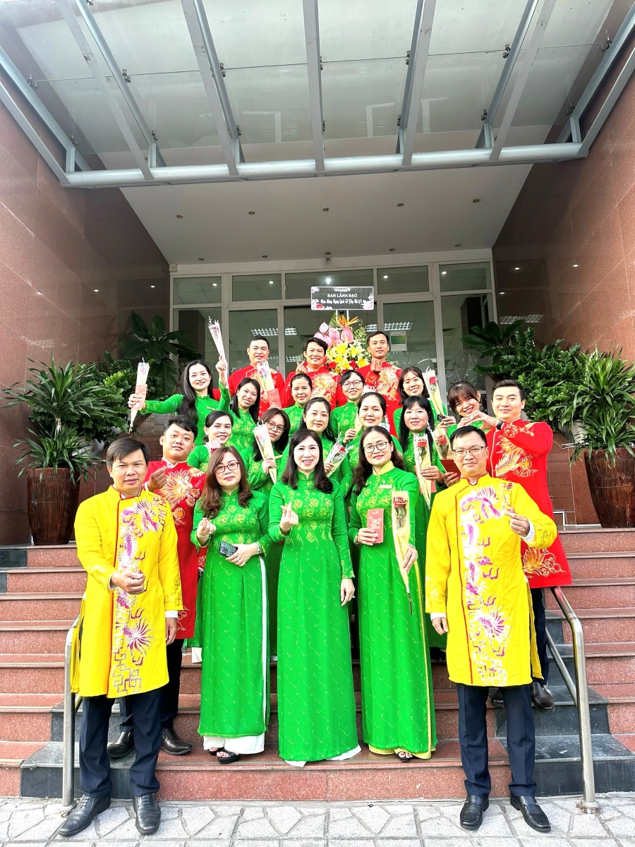 Đồng chí Trần Văn Sốn - Phó Giám đốc, Chủ tịch Công đoàn cơ sở Vietcombank Cà Mau chụp hình lưu niệm cùng toàn thể chị em trong chi nhánh