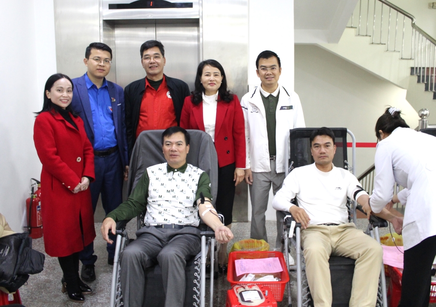 Đ/c Đặng Ngọc Hùng - Phó Giám đốc, Chủ tịch CĐCS Vietcombank Móng Cái (ngoài cùng hàng trên bên phải) cùng các đồng chí lãnh đạo thành phố động viên các tình nguyện viên tham gia hiến máu