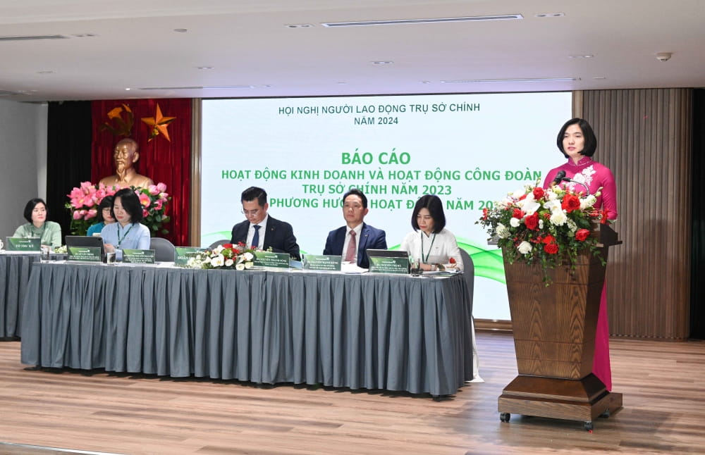 Báo cáo kết quả hoạt động kinh doanh, việc thực hiện chế độ chính sách đối với NLĐ năm 2023 và phương hướng nhiệm vụ năm 2024, đồng chí Phùng Nguyễn Hải Yến - Phó Tổng Giám đốc, Chủ tịch Công đoàn TSC cho biết: Năm 2023, Vietcombank luôn kiên định quán triệt các chủ trương, chính sách của Chính phủ và chỉ đạo điều hành của Ngân hàng Nhà nước để đề ra những định hướng chiến lược phát triển phù hợp với diễn biến kinh tế vĩ mô và thực tiễn của thị trường, hoàn thành vượt mức các chỉ tiêu kinh doanh trọng yếu, tiếp tục duy trì vị thế là ngân hàng dẫn đầu Việt Nam về chất lượng, hiệu quả hoạt động. TSC ngoài việc đóng góp vào kết quả kinh doanh chung của hệ thống năm 2023, đã đi đầu thực hiện nhiều công việc lớn, quan trọng, thể hiện vai trò đầu não trong quản trị, điều hành. Đặc biệt, TSC đã trực tiếp thực hiện và chỉ đạo toàn hệ thống triển khai thành công hàng loạt sự kiện đặc biệt lớn trong chuỗi hoạt động chào mừng kỷ niệm 60 năm thành lập Vietcombank và đón nhận danh hiệu Anh hùng Lao động, tạo dấu ấn đậm nét cho thương hiệu Vietcombank, được cộng đồng xã hội đánh giá cao. TSC đã thực hiện tốt chế độ chính sách với đoàn viên, người lao động và đẩy mạnh hoạt động công đoàn trên nhiều lĩnh vực. Là Công đoàn cơ sở lớn nhất của Công đoàn toàn hệ thống Vietcombank, hoạt động có những nét đặc thù riêng, trong những năm qua, Công đoàn TSC luôn làm tốt vai trò, chức năng, nhiệm vụ, chăm lo cải thiện đời sống vật chất, tinh thần, bảo vệ quyền và lợi ích hợp pháp, chính đáng cho NLĐ. BCH Công đoàn TSC đã chủ động phối hợp với lãnh đạo chuyên môn duy trì tốt các hoạt động thể thao và phong trào, nâng cao đời sống tinh thần cho ĐV, NLĐ. Các phong trào hoạt động đều gắn công tác thi đua tạo động lực, trực tiếp động viên khích lệ các tập thể, cá nhân người lao động hoàn thành xuất sắc nhiệm vụ chuyên môn và đoàn thể được giao. Công tác giáo dục tuyên truyền về chia sẻ trách nhiệm đối với xã hội cũng luôn được gắn với thực tế tổ chức các hoạt động an sinh xã hội ý nghĩa hướng đến cộng đồng. Công tác đào tạo, nghiên cứu khoa học, nâng cao trình độ tay nghề cho cán bộ ngày càng được chú trọng và đầu tư thích đáng. Công đoàn TSC cũng đã làm tốt công tác nắm bắt tâm tư, nguyện vọng của NLĐ, đề xuất báo cáo Ban lãnh đạo xem xét, giải quyết; kịp thời hỗ trợ động viên nhiều trường hợp ĐV, NLĐ có hoàn cảnh khó khăn…