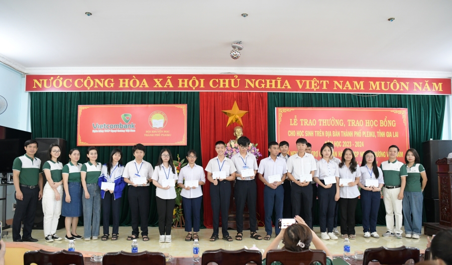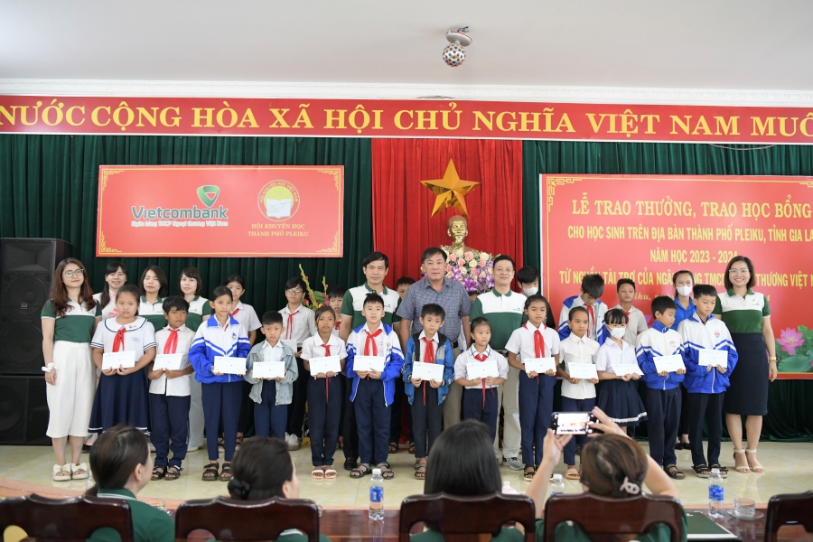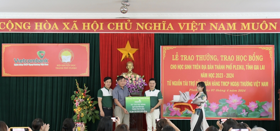 Với tinh thần đó, Vietcombank đã thực hiện trao tặng nguồn tài trợ trang thiết bị phục vụ giảng dạy học tập, hoạt động thường xuyên của trường và học bổng cho học sinh, sinh viên trên địa bàn thành phố Pleiku, tỉnh Gia Lai trị giá 150 triệu đồng từ nguồn chi phí an sinh xã hội toàn hệ thống thông qua Quỹ Khuyến học thành phố Pleiku, tỉnh Gia Lai. Bằng nguồn tài trợ nói trên, nhân dịp này Vietcombank đã thực hiện trao tặng 77 suất học bổng cho các em học sinh đạt thành tích cao trong học tập năm học 2023 - 2024 và các em học sinh có hoàn cảnh khó khăn tại các trường trên địa bàn tỉnh Gia Lai.