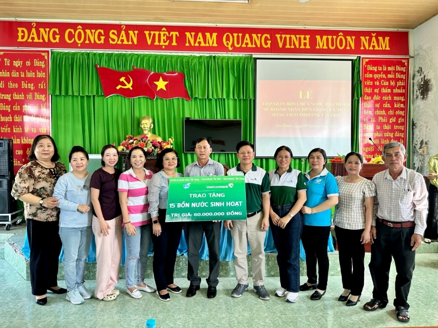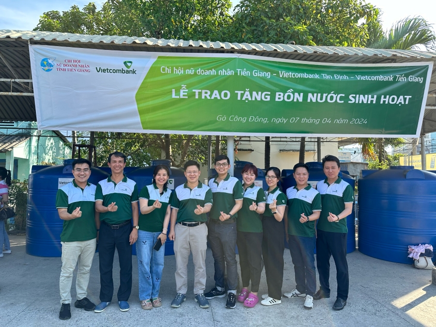Ngày 07/04/2024, Vietcombank Tân Định, Vietcombank Tiền Giang và Chi Hội nữ Doanh nhân Tiền Giang đã phối hợp thực hiện chương trình trao tặng 15 bồn chứa nước dung tích 3000 lít và 10.000 khối nước sạch với tổng giá trị 60.000.000 đồng cho bà con ở 5 xã thuộc huyện Gò Công Đông, tỉnh Tiền Giang.