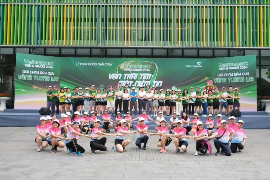Đại diện Ban lãnh đạo Vietcombank cùng các VĐV chụp hình lưu niệm tại lễ khai mạc giải chạy “Vietcombank Run & Share: Vạn trái tim - Một niềm tin” nhằm gây quỹ “Vững tương lai” năm 2024