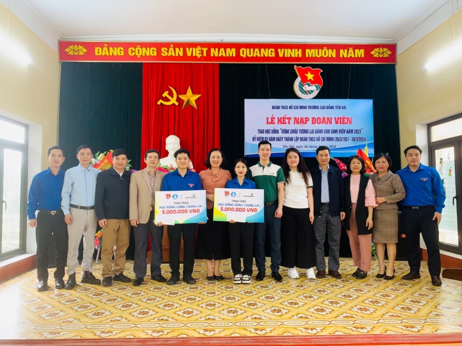Đ/c Lâm Tùng - Phó Trưởng ban Thanh niên trường học Trung ương Đoàn (thứ 3 từ trái sang) và đ/c Dương Bảo Trung - Bí thư Đoàn Thanh niên Vietcombank (thứ 3 từ phải sang) trao tặng học bổng loại A đến các em học sinh nghèo vượt khó