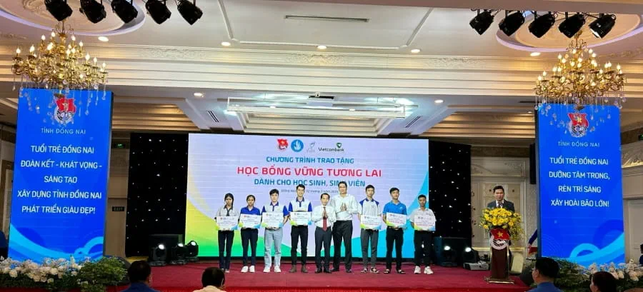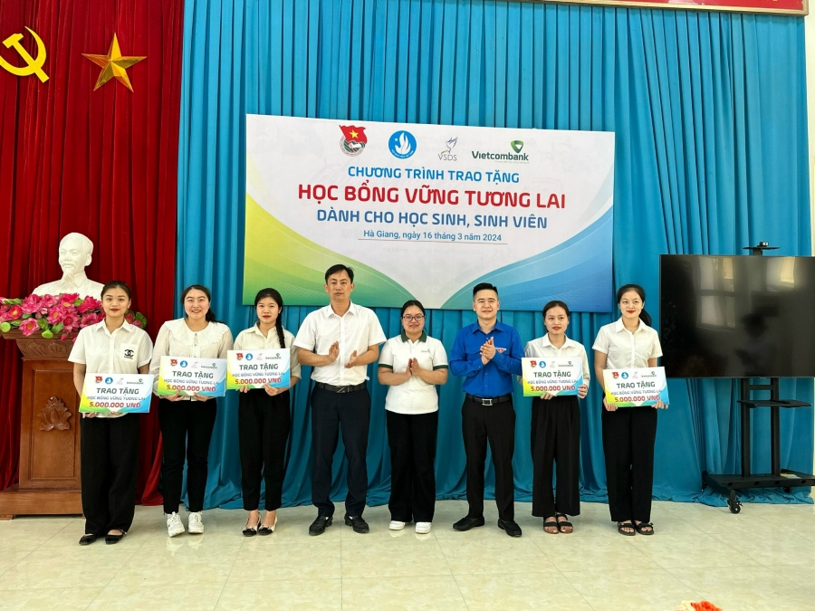 Đồng chí Bùi Quang Huy - Ủy viên dự khuyết BCH Trung ương Đảng, Bí thư thứ nhất Trung ương Đoàn (ngoài cùng bên phải) và đồng chí Nguyễn Thanh Tùng - Tổng Giám đốc Vietcombank (ngoài cùng bên trái) trao học bổng "Vững bước tương lai" loại A tặng học sinh, sinh viên xuất sắc