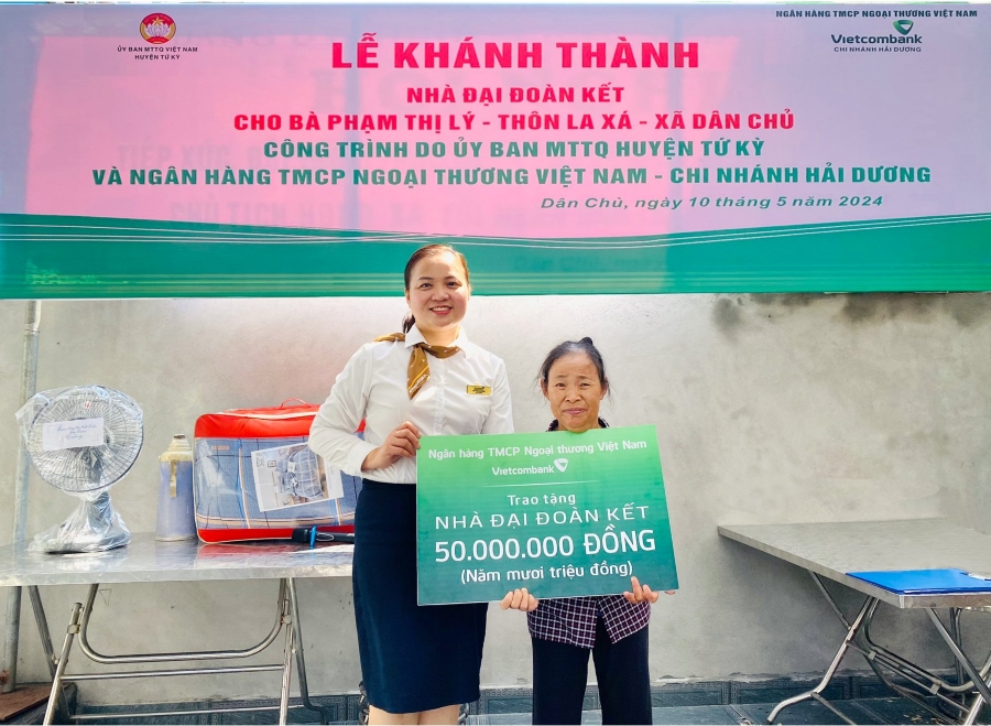 Sáng ngày 10/5/2024, Vietcombank Hải Dương đã phối hợp với Ủy ban MTTQ xã Dân Chủ, huyện Tứ Kỳ tổ chức bàn giao nhà đại đoàn kết cho bà Phạm Thị Lý ở thôn La Xá, xã Dân Chủ, huyện Tứ Kỳ.