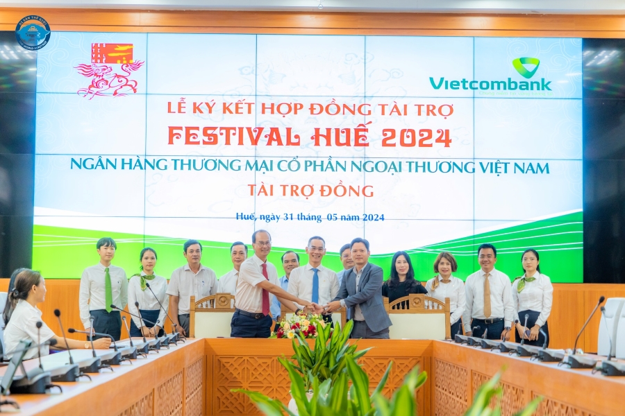 Sáng ngày 31/5/2024, tại hội trường UBND tỉnh Thừa Thiên Huế đã diễn ra Lễ ký kết hợp đồng quảng cáo thương hiệu tại Festival Huế 2024 giữa Ngân hàng TMCP Ngoại thương Việt Nam (Vietcombank) và Ban tổ chức Festival Huế 2024.