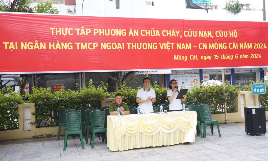 Ngày 15/6/2024, Vietcombank Móng Cái đã phối hợp với Đội Cảnh sát Phòng cháy chữa cháy và cứu nạn cứu hộ (PCCC và CNCH) - Công an thành phố Móng Cái tổ chức diễn tập phương án chữa cháy tại trụ sở chi nhánh với sự tham gia của lực lượng phòng cháy chữa cháy và toàn thể cán bộ nhân viên. Tham dự chương trình có ông Đặng Ngọc Hùng - Phó Giám đốc Vietcombank Móng Cái.
