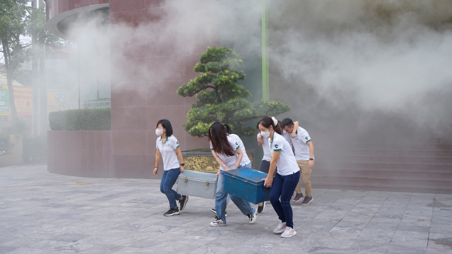 Cán bộ Vietcombank Móng Cái thực hành diễn tập PCCC