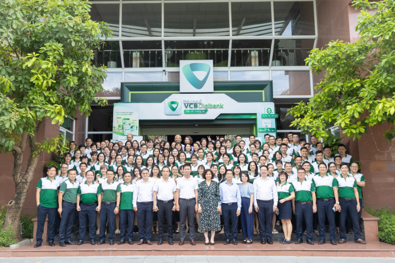 Bà Đinh Thị Thái - Phó Tổng Giám đốc (ngoài cùng bên trái), ông  Lý Hoàng Vũ - Bí thư Đảng ủy, Giám đốc Vietcombank Đà Nẵng (ngoài cùng bên phải) trao thưởng cho đại diện các nhóm