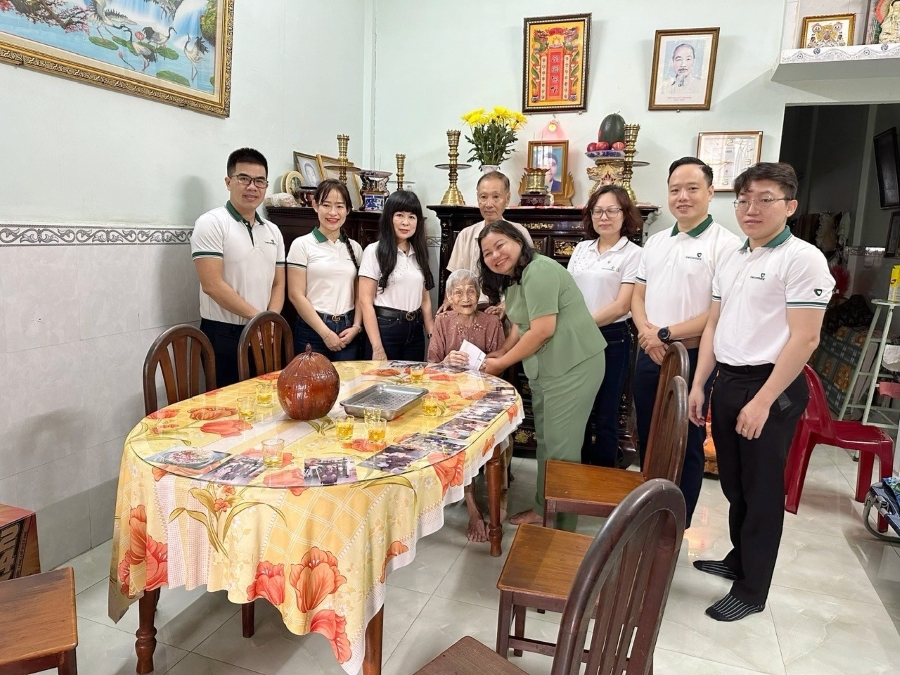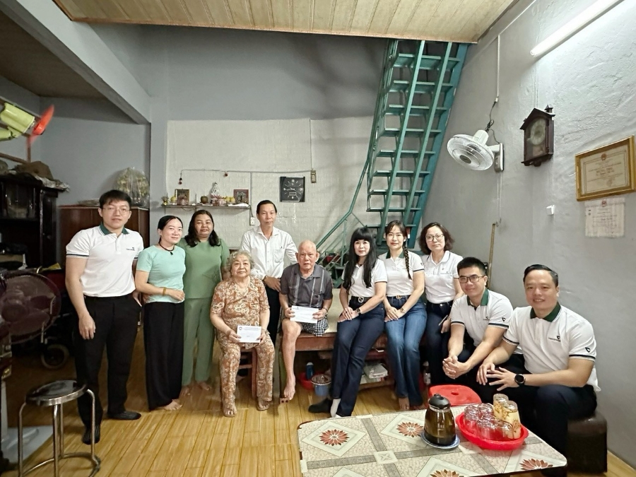 Đ/c Nguyễn Thị Tố Hương - CT CĐCS, Phó Giám đốc (ngồi thứ 5 từ phải qua), đ/c Nguyễn Dũng Hùng - UVBTV, Chủ tịch UB MTTQ Quận 7 (đứng thứ 5 từ trái qua) và đ/c Hồ Thị Phước Lộc - Quận ủy viên, PCT TT UB MTTQ Quận 7( đứng thứ 3 từ trái qua) và các đồng chí trong BCH CĐCS, BCH Đoàn cơ sở Vietcombank Nam Sài Gòn tặng quà cho đ/c thương binh Nguyễn Văn Che