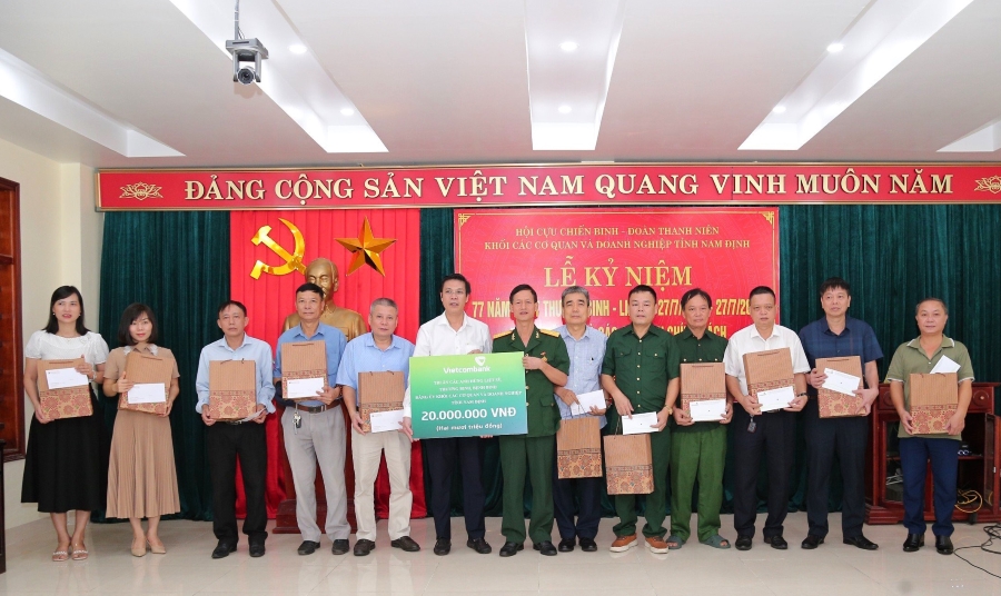 Tiếp đó, ngày 24/7/2024, đại diện Ban an sinh xã hội Vietcombank Nam Định phối hợp với Hội Cựu chiến binh và Đoàn Thanh niên Khối các cơ quan và Doanh nghiệp tỉnh Nam Định trao 40 phần quà cho các hội viên là thương binh, hội viên, đoàn viên và con Thương binh - Liệt sỹ trong Khối.