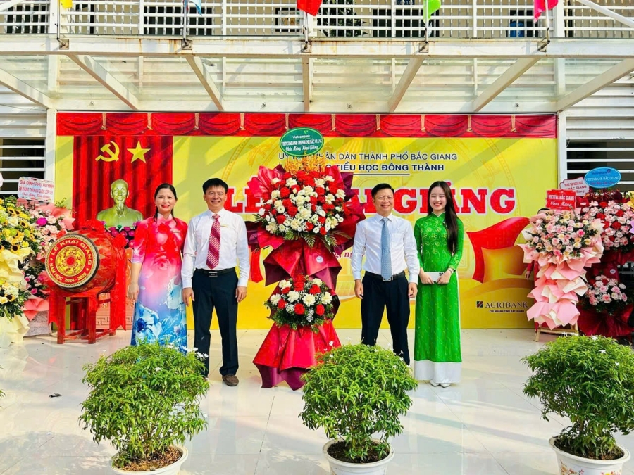 Ông Nguyễn Xuân Thể - Phó Giám đốc Vietcombank Bắc Giang (đứng thứ 2 từ phải sang) tặng hoa chúc mừng Trường Tiểu học Đông Thành, TP Bắc Giang