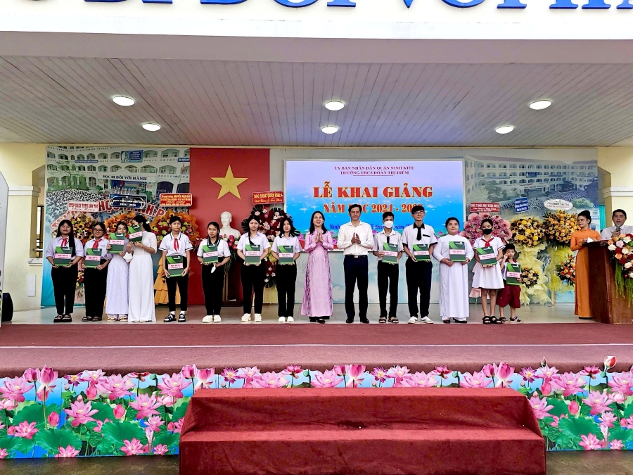 Sáng ngày 05/9/2024, tại lễ khai giảng năm học mới 2024 - 2025 của Trường THCS Đoàn Thị Điểm (quận Ninh Kiều, TP. Cần Thơ), Vietcombank Cần Thơ phối hợp cùng Báo Cần Thơ tổ chức chương trình “Tiếp sức đến trường”, trao 50 suất học bổng (trị giá 1 triệu đồng/suất) cho các em học sinh có hoàn cảnh khó khăn trên địa bàn thành phố.