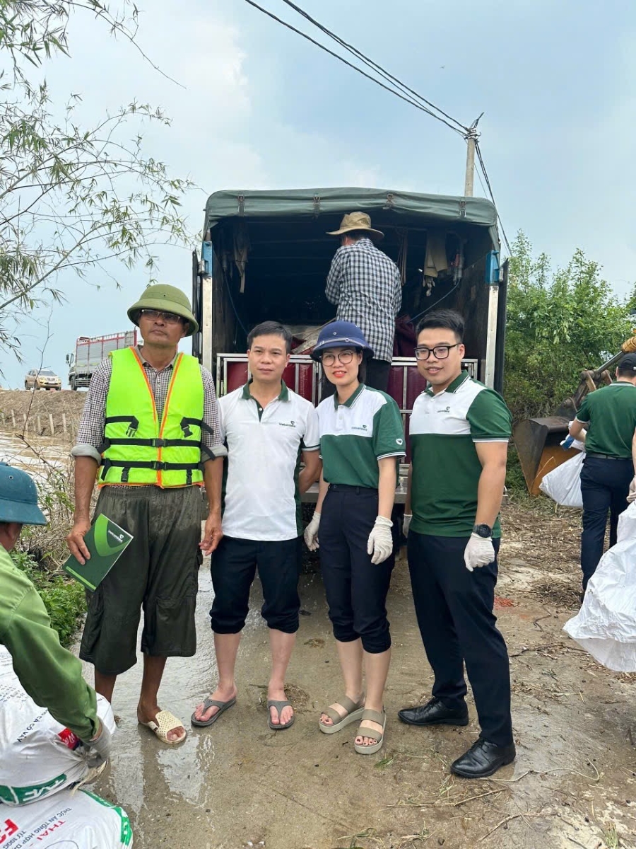 Đoàn viên thanh niên Chi đoàn Vietcombank Chí Linh cùng khách hàng là hộ kinh doanh cá lồng bị ảnh hưởng sau bão lũ
