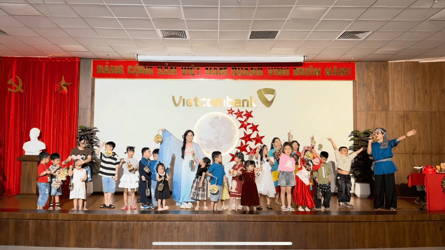 Con em cán bộ Vietcombank Bạc Liêu chụp ảnh lưu niệm tại chương trình vui trung thu với chủ đề “Hành trình về cung trăng”