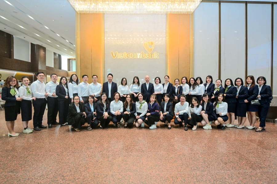 Tập thể đảng viên chi bộ 31 tham dự buổi sinh hoạt chuyên đề chụp ảnh lưu niệm tại sảnh tòa nhà Trụ sở chính Vietcombank