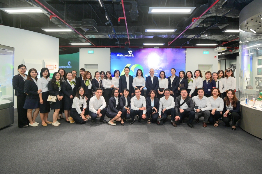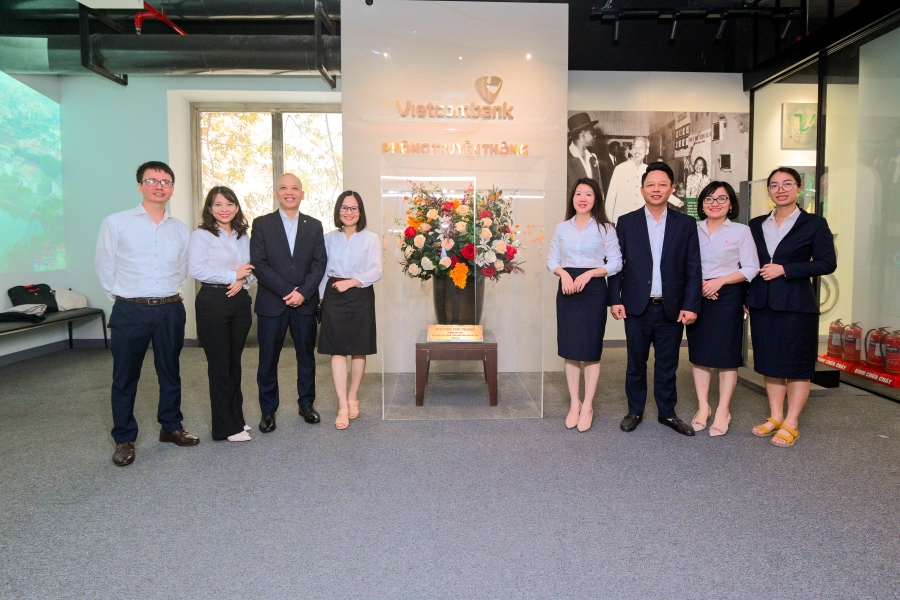 Các đồng chí lãnh đạo Trung tâm và lãnh đạo phòng nghiệp vụ VCC chụp ảnh lưu niệm bên kỷ vật do cố Tổng Bí thư Nguyễn Phú Trọng trao tặng Vietcombank