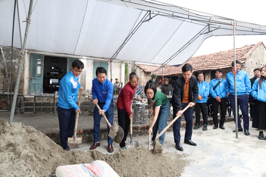 Từ trái qua phải, đồng chí Bùi Hải Bằng - Bí thư tỉnh Đoàn Hải Dương; đồng chí Lương Minh Tùng - Bí thư tỉnh Đoàn Phú Yên; bà Lê Thị Đát; đồng chí Nguyễn Thị Hương Thảo - Bí thư Chi đoàn cơ sở Vietcombank Chí Linh, đồng chí Phương Đình Hậu - Phó chủ tịch UBND xã Nhân Huệ - TP Chí Linh thực hiện nghi thức khởi công công trình