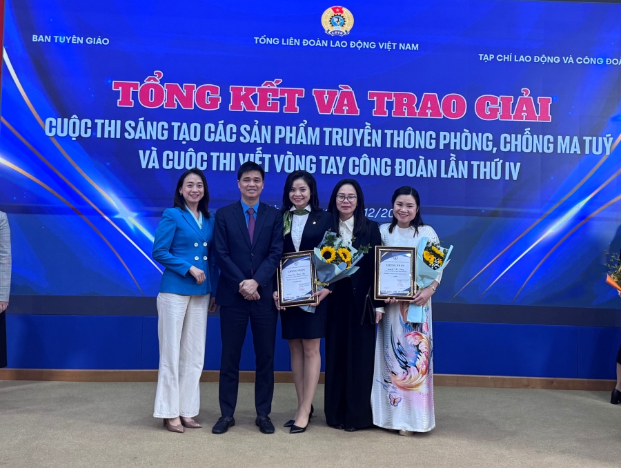 Đoàn viên Công đoàn Đào Thanh Thảo (thứ hai từ trái sang) nhận giải khuyến khích cuộc thi “Vòng tay Công đoàn”