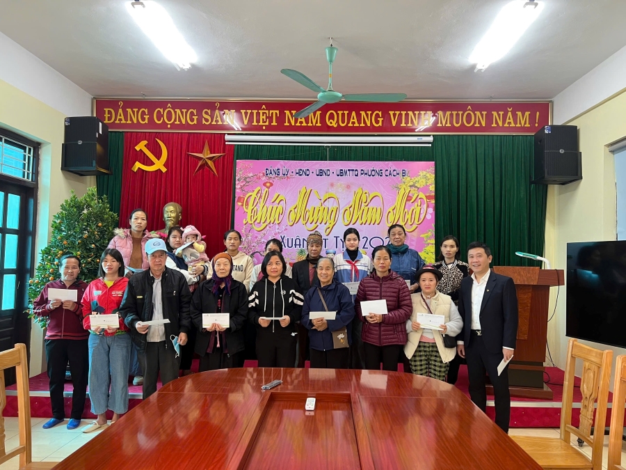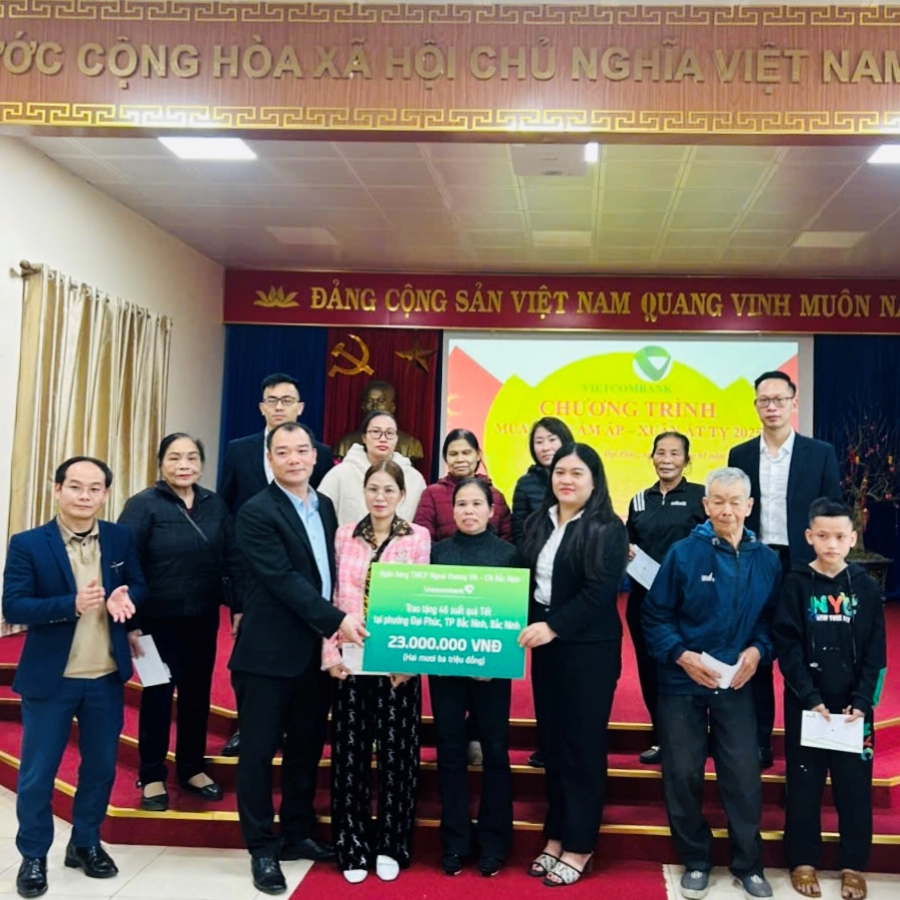 Từ ngày 20/01/2025, đại diện BCH CĐCS Vietcombank Bắc Ninh và các PGD đã trao tặng 140 suất quà với tổng giá trị 70 triệu đồng và gửi lời chúc năm mới nhiều sức khỏe, hạnh phúc, đầm ấm tới các hộ có hoàn cảnh đặc biệt khó khăn, hộ cận nghèo, người khuyết tật tại các địa bàn: phường Đại Phúc (TP Bắc Ninh) 46 suất, phường Phương Liễu (TX Quế Võ) 32 suất, phường Cách Bi (TX Quế Võ) 19 suất, xã Ngọc Xá (TX Quế Võ) 13 suất, thị trấn Chờ (huyện Yên Phong) 30 suất.