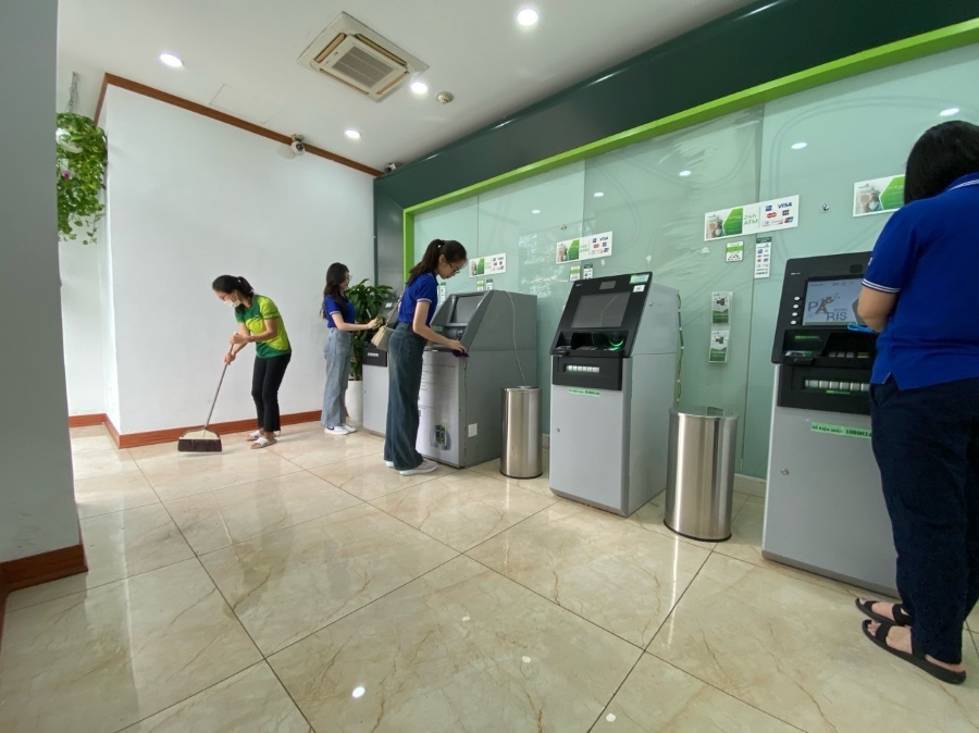 Đoàn Thanh niên Vietcombank Hà Nội dọn dẹp, vệ sinh hệ thống máy ATM tại tất cả các điểm giao dịch của Chi nhánh Hà Nội.
