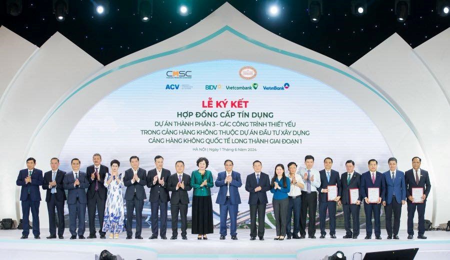 Thủ tướng Chính phủ Phạm Minh Chính cùng các đại biểu chụp ảnh lưu niệm và chúc mừng thành công của Lễ ký kết hợp đồng cấp tín dụng Dự án thành phần 3 thuộc Dự án đầu tư xây dựng Cảng hàng không quốc tế Long Thành giai đoạn 1