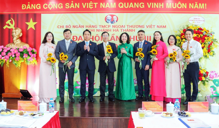 Đ/c Nguyễn Mạnh Hùng - Ủy viên Ban Thường vụ Đảng ủy, Thành viên Hội đồng quản trị Vietcombank(thứ 3 từ trái sang) cùng đ/c Trần Thị Hạnh - Ủy viên BCH Đảng bộ, Phó trưởng Ban Tuyên giáo Đảng ủy (thứ 5 từ phải sang) tặng hoa chúc mừng các đ/c trúng cử BCH Chi bộ Vietcombank Hà Thành nhiệm kỳ 2025 - 2030