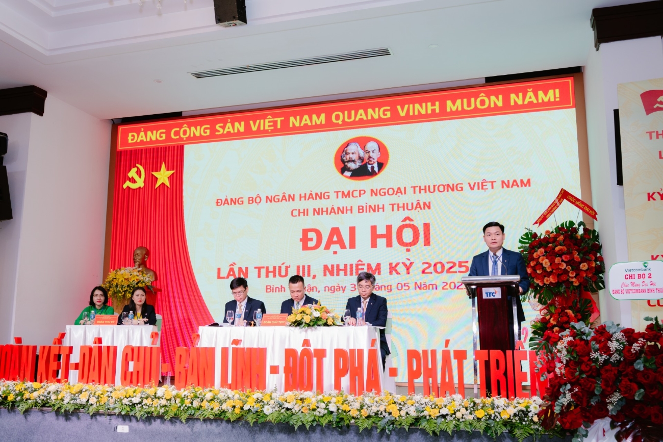 Trong không khí thi đua sôi nổi lập thành tích chào mừng 50 năm ngày giải phóng miền Nam, thống nhất đất nước, 135 năm ngày sinh Chủ tịch Hồ Chí Minh, 80 năm Quốc khánh nước Cộng hòa XHCN Việt Nam và tiến tới Đại hội Đại biểu toàn quốc lần thứ XIV của Đảng, Đại hội đại biểu Đảng bộ Vietcombank lần thứ V, sáng ngày 31/5/2025, tại thành phố Phan Thiết, Đảng bộ Vietcombank Bình Thuận đã trang trọng tổ chức Đại hội Đảng bộ lần thứ III, nhiệm kỳ 2025 - 2030.