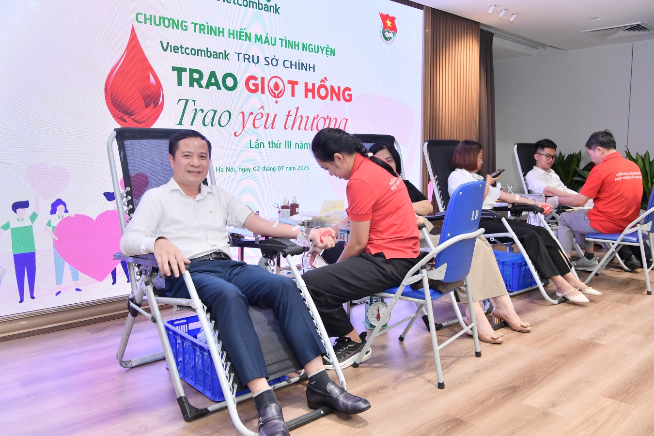 Sáng 02/7/2025, tại Trụ sở chính (TSC) Ngân hàng TMCP Ngoại thương Việt Nam (Vietcombank), Công Đoàn TSC và Đoàn Thanh niên TSC đã phối hợp với Viện Huyết học - Truyền máu Trung ương tổ chức chương trình hiến máu tình nguyện năm 2025 với chủ đề “Vietcombank: Trao giọt hồng - Trao yêu thương”.