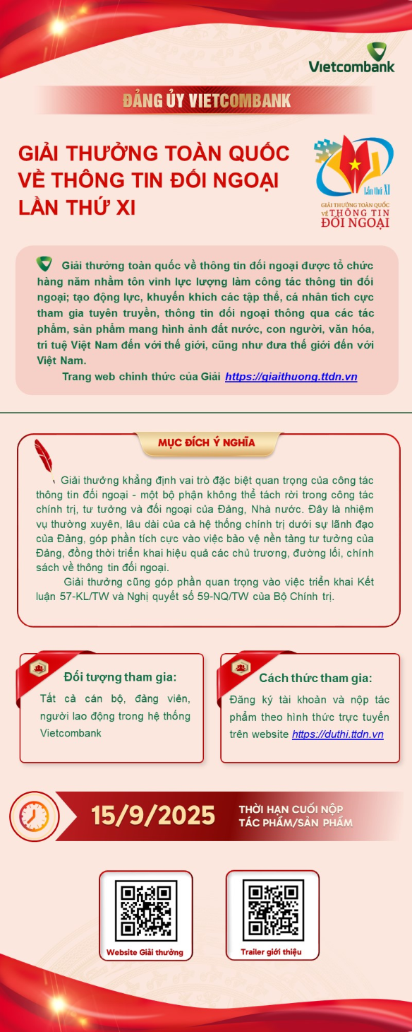 Thực hiện Công văn số 102-CV/BTGDV ngày 22/7/2025 của Ban Tuyên giáo và Dân vận Đảng ủy Chính phủ về việc tăng cường thông tin, tuyên truyền tham gia Giải thưởng toàn quốc về thông tin đối ngoại lần thứ XI; để Giải thưởng được tổ chức thành công, trở thành hoạt động sinh hoạt chính trị, xã hội có sức lan tỏa sâu rộng, hướng tới chào mừng Đại hội đại biểu toàn quốc lần thứ XIV của Đảng, Đảng ủy Ngân hàng TMCP Ngoại thương Việt Nam đã lãnh đạo chỉ đạo tăng cường tuyên truyền về thông tin Giải thưởng, yêu cầu các cấp ủy, tổ chức Đảng trực thuộc phổ biến, tuyên truyền sâu rộng về Giải thưởng đến cán bộ, đảng viên và người lao động tại đơn vị; khuyến khích các tập thể, cá nhân tích cực tham gia sáng tạo, gửi tác phẩm dự thi, góp phần lan tỏa hình ảnh Vietcombank gắn với hình ảnh đất nước, con người Việt Nam trong thời kỳ hội nhập.