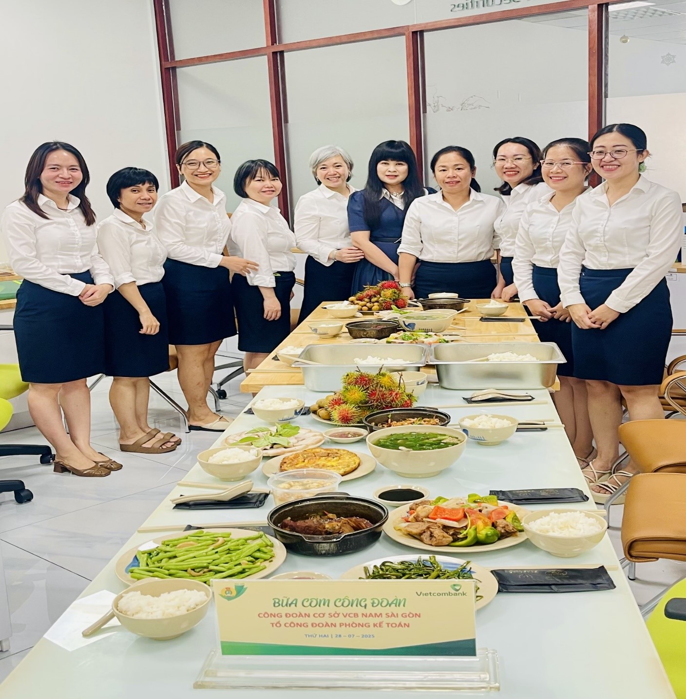 100% Tổ Công đoàn trực thuộc CĐCS Vietcombank Nam Sài Gòn đã tổ chức thành công “Bữa cơm Công đoàn” với sự hưởng ứng tham gia nhiệt tình và tinh thần phấn khởi của toàn thể đoàn viên, người lao động. Các bữa cơm trưa được tổ chức giản dị nhưng chu đáo trong không khí đầm ấm, vui tươi. Các món ăn được lựa chọn kỹ, thực đơn cân đối, đầy đủ các nhóm dưỡng chất cần thiết, bảo đảm các tiêu chí an toàn vệ sinh, tiết kiệm và ý nghĩa.