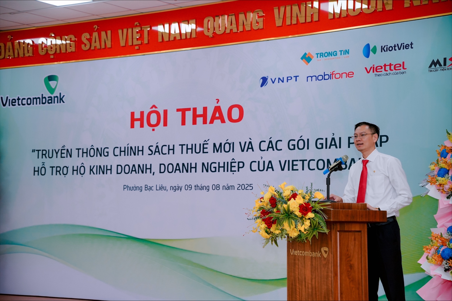 Phát biểu khai mạc, ông Đậu Tuấn Cường - Giám đốc Vietcombank Bạc Liêu khẳng định: “Việc nắm bắt kịp thời các chính sách thuế mới cũng như tận dụng hiệu quả các gói hỗ trợ tài chính là yếu tố then chốt giúp doanh nghiệp nâng cao năng lực cạnh tranh và phát triển bền vững. Vietcombank Bạc Liêu cam kết đồng hành cùng quý doanh nghiệp, cung cấp nhiều giải pháp tài chính linh hoạt, đồng thời cung cấp thông tin chính sách một kịp thời và thiết thực”.