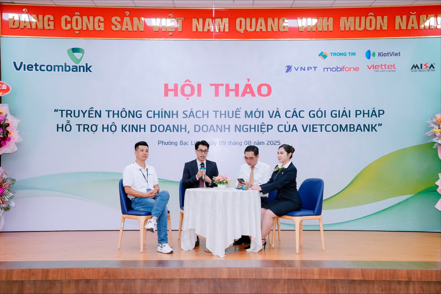 Hội thảo có sự tham gia của ông Đậu Tuấn Cường - Giám đốc chi nhánh; Luật sư Nguyễn Văn Được - Chuyên gia tư vấn thuế, Tổng Giám đốc Công ty TNHH Kế toán và Tư vấn thuế Trọng Tín; ông Nguyễn Duy Phương - Trưởng phòng kinh doanh CTCP công nghệ KiotViet, cùng hàng trăm khách mời là hộ kinh doanh, khách hàng thân thiết của Vietcombank Bạc Liêu.