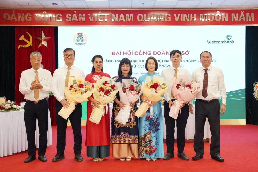 Đ/c Nguyễn Duy Hưng - Ủy viên Ban Chấp hành Công đoàn Vietcombank, Phó Trưởng Cơ quan công đoàn Vietcombank (ngoài cùng bên trái) và đ/c Lê Xuân Trường - Bí thư Chi bộ, Giám đốc Vietcombank Lạng Sơn (ngoài cùng bên phải) tặng hoa chúc mừng Ban Chấp hành Công đoàn cơ sở nhiệm kỳ 2025-2030
