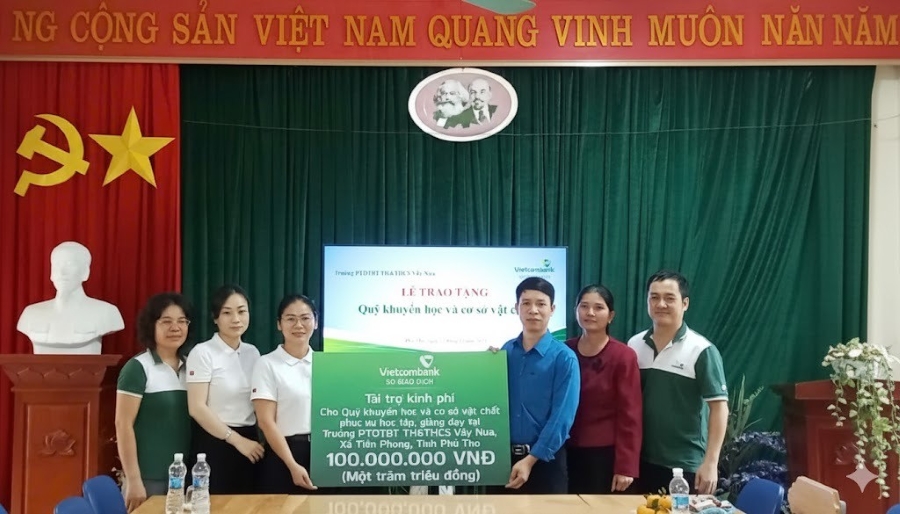 Tại chương trình, Vietcombank Sở Giao dịch đã tài trợ 100 triệu đồng cho Quỹ khuyến học và hỗ trợ cơ sở vật chất phục vụ giảng dạy, học tập tại Trường phổ thông Dân tộc Bán trú Tiểu học và THCS Vầy Nưa, đồng thời trao tặng 3 bộ máy vi tính cho Uỷ ban nhân dân xã Tiền Phong, tỉnh Phú Thọ nhằm phục vụ công tác chuyên môn và chuyển đổi số tại cơ sở. Thay mặt cấp ủy, chính quyền địa phương, ông Hoàng Văn Đảm - Bí thư Đảng ủy, Chủ tịch HĐND xã Tiền Phong trân trọng cảm ơn sự quan tâm hỗ trợ của Vietcombank Sở giao dịch. Nguồn hỗ trợ này có ý nghĩa thiết thực, giúp địa phương tăng cường cơ sở vật chất trường lớp, tạo điều kiện thuận lợi hơn cho công tác dạy và học tại địa phương.