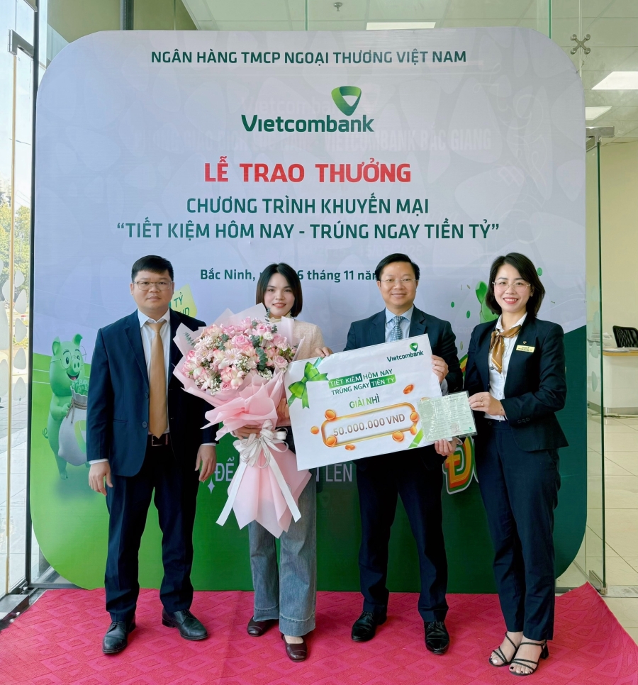 Chương trình “Tiết kiệm hôm nay - trúng ngay tiền tỷ” được Vietcombank triển khai từ 25/9/2025 - 31/10/2025. Sau khi kết thúc chương trình, Vietcombank đã thực hiện quay số để xác định danh sách các khách hàng trúng thưởng, bao gồm 01 khách hàng trúng giải Đặc biệt trị giá 1 tỷ đồng, 10 khách hàng trúng giải Nhất trị giá 100 triệu đồng/giải, 20 khách hàng trúng giải Nhì trị giá 50 triệu đồng/giải. Vietcombank Bắc Giang có 01 khách hàng trúng giải Nhì trị giá 50 triệu đồng.