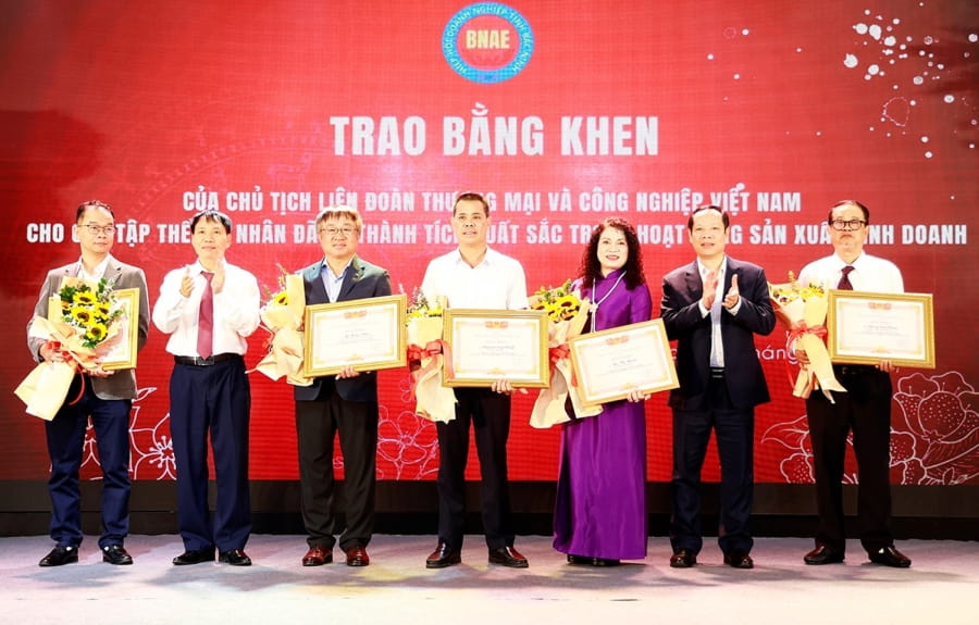 Ông Lê Hồng Tâm - Giám đốc Vietcombank Bắc Giang (đứng thứ 3 từ trái sang) nhận bằng khen tập thể đã có thành tích xuất sắc trong hoạt động xây dựng và phát triển Hiệp hội Doanh nghiệp tỉnh Bắc Ninh