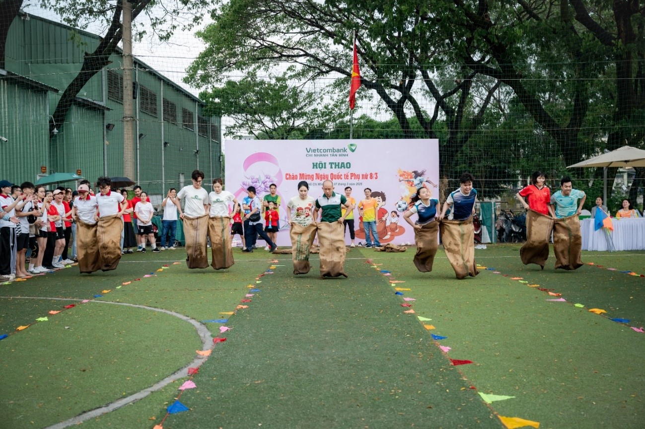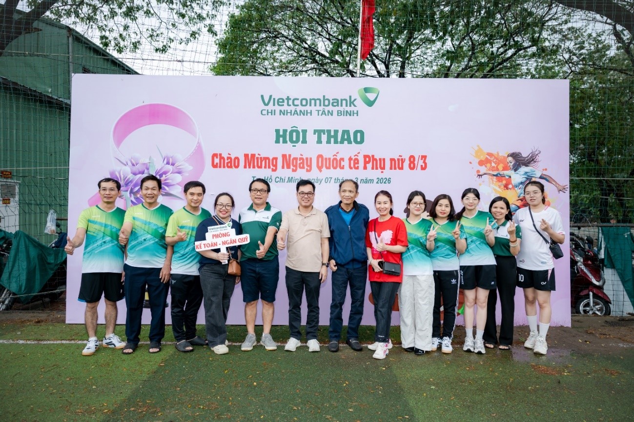 Chiều ngày 07/3/2026, tại sân bóng 72 Nguyễn Đỗ Cung, phường Tây Thạnh, TP. Hồ Chí Minh, Công đoàn cơ sở Vietcombank Tân Bình phối hợp cùng Đoàn Thanh niên đã tổ chức thành công Hội thao chào mừng Ngày Quốc tế Phụ nữ, đồng thời hướng tới kỷ niệm 63 năm Ngày thành lập Ngân hàng TMCP Ngoại thương Việt Nam (01/4/1963 - 01/4/2026).