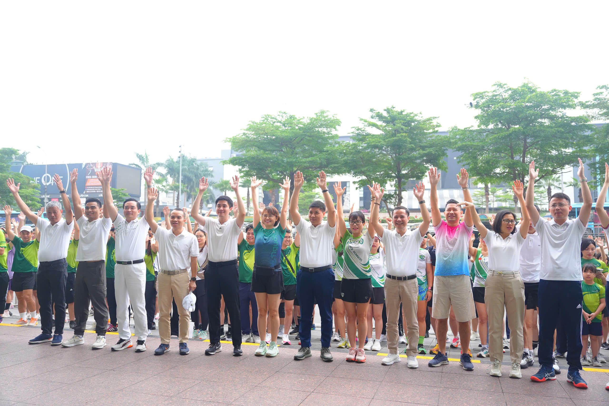 Khoảnh khắc lãnh đạo Vietcombank cùng các đại biểu, khách mời và cán bộ, người lao động đồng loạt giơ cao tay khởi động “Vietcombank Run & Share 2026” – nơi mỗi bước chạy bắt đầu một hành trình sẻ chia