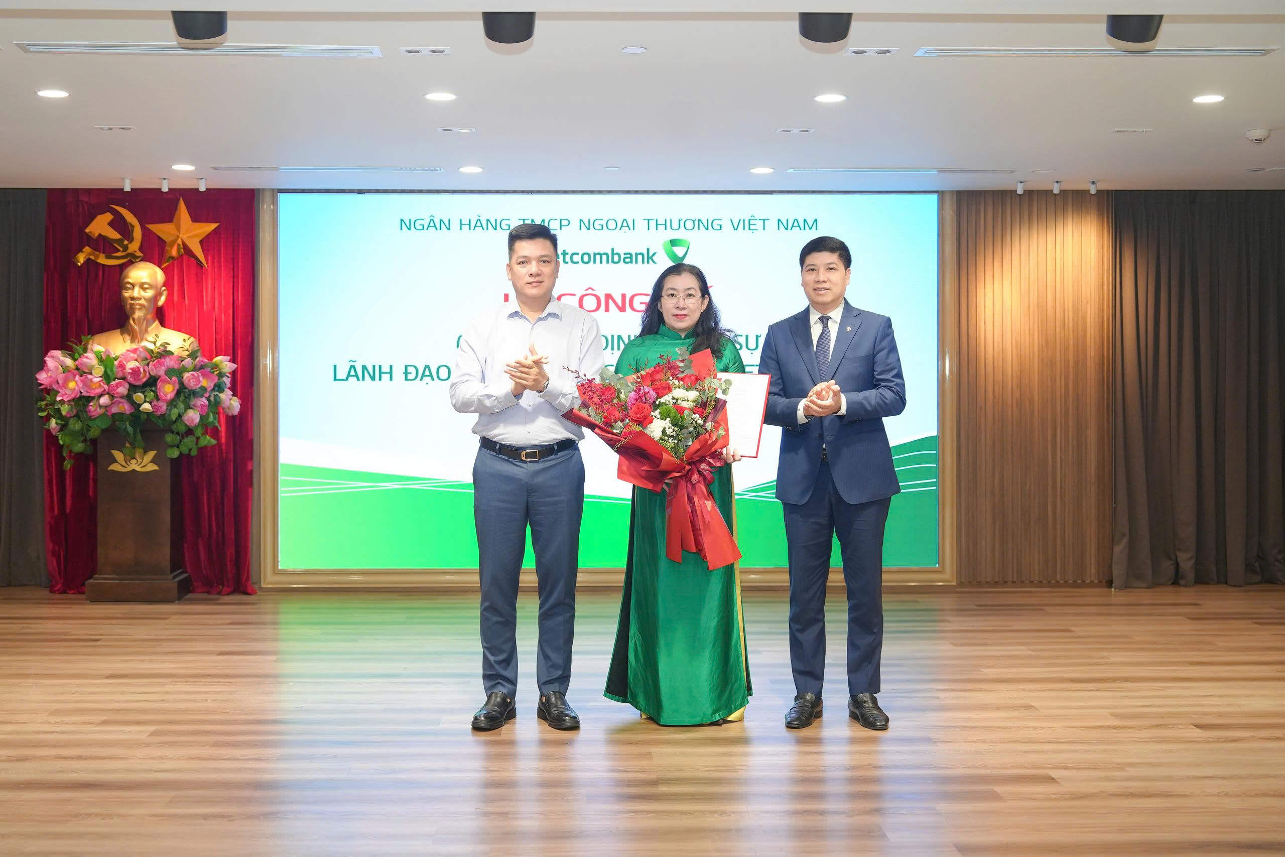 Ông Hồng Quang - Thành viên HĐQT kiêm Giám đốc Khối Nhân sự Vietcombank (bên phải) trao quyết định và bà Nguyễn Thị Hồng Vân - Giám đốc Khối Pháp chế & Tuân thủ (bên trái) tặng hoa chúc mừng bà Nguyễn Thu Hằng - tân Phó trưởng Phòng Quản lý rủi ro tín dụng