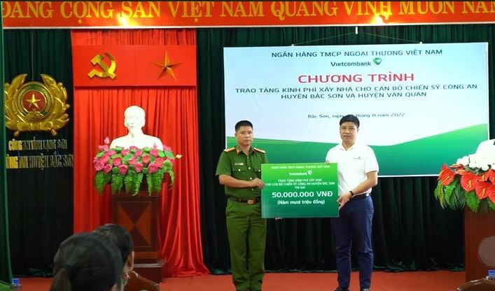 Đ/c Hồng Quang - Ủy viên Ban Thường vụ Đảng ủy Vietcombank, Thành viên HĐQT kiêm Giám đốc Khối Nhân sự, Chủ tịch Công đoàn Vietcombank trao biểu trưng tài trợ kinh phí xây nhà cho cán bộ chiến sỹ công an huyện Bắc Sơn và huyện Văn Quan