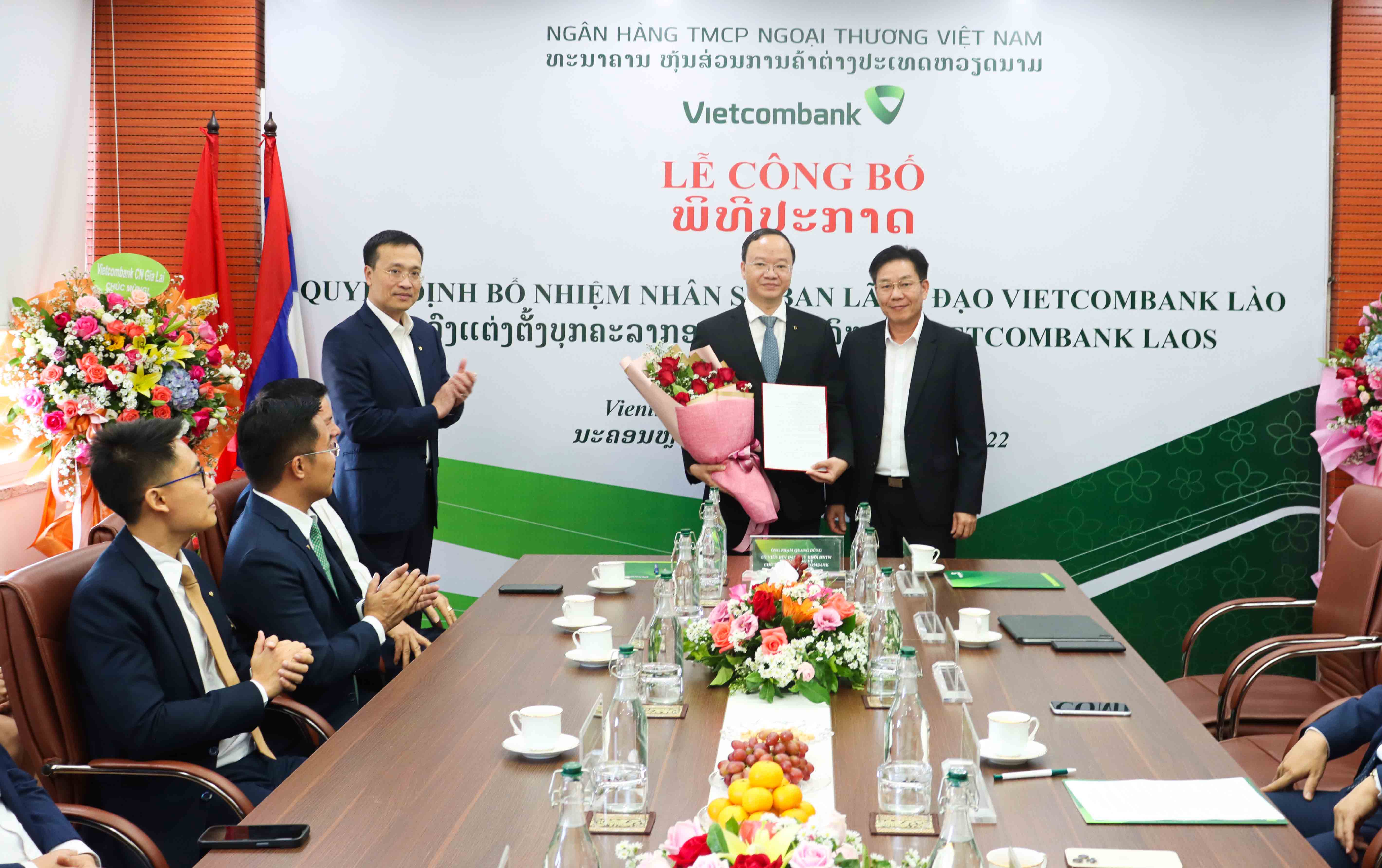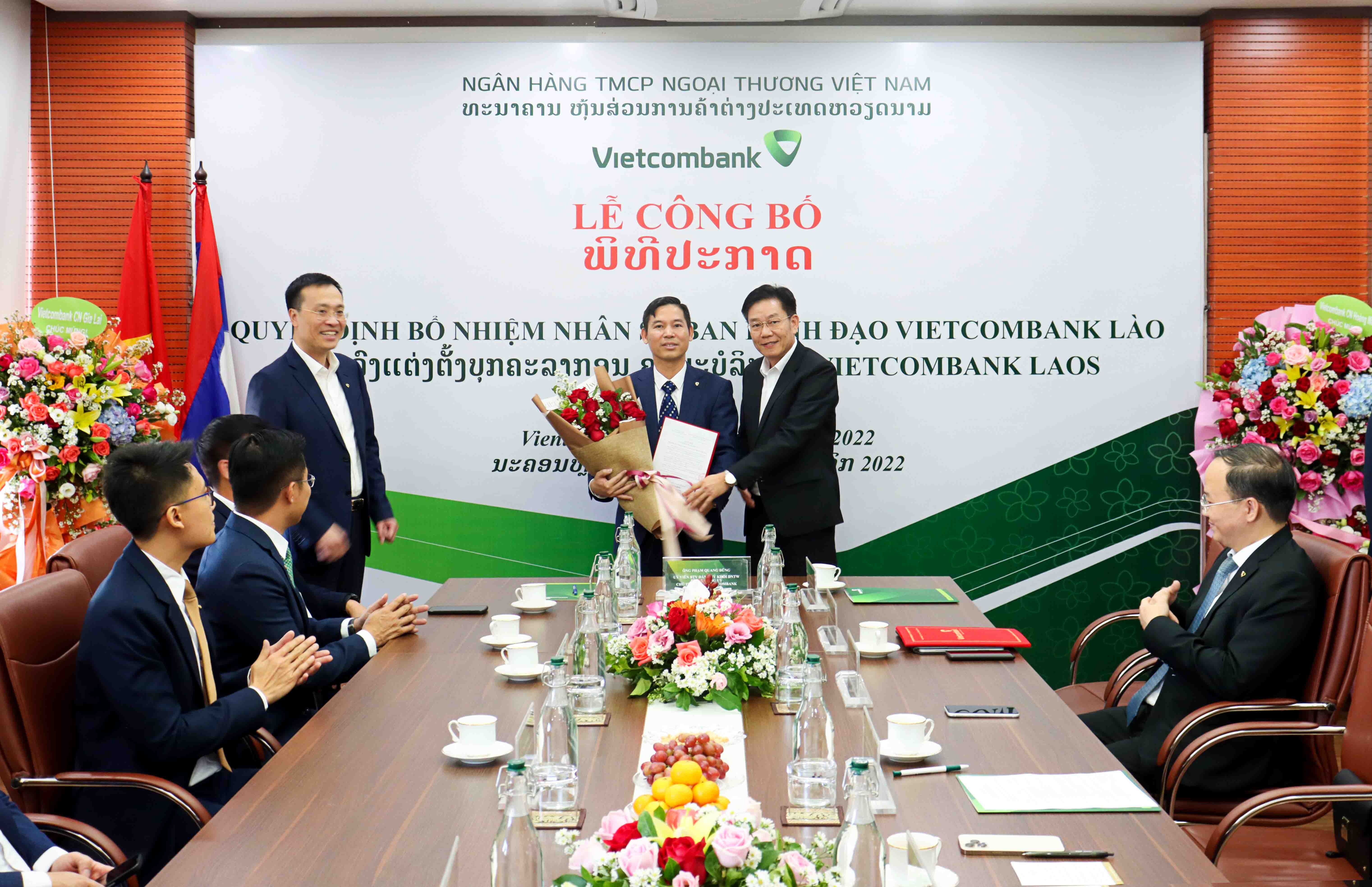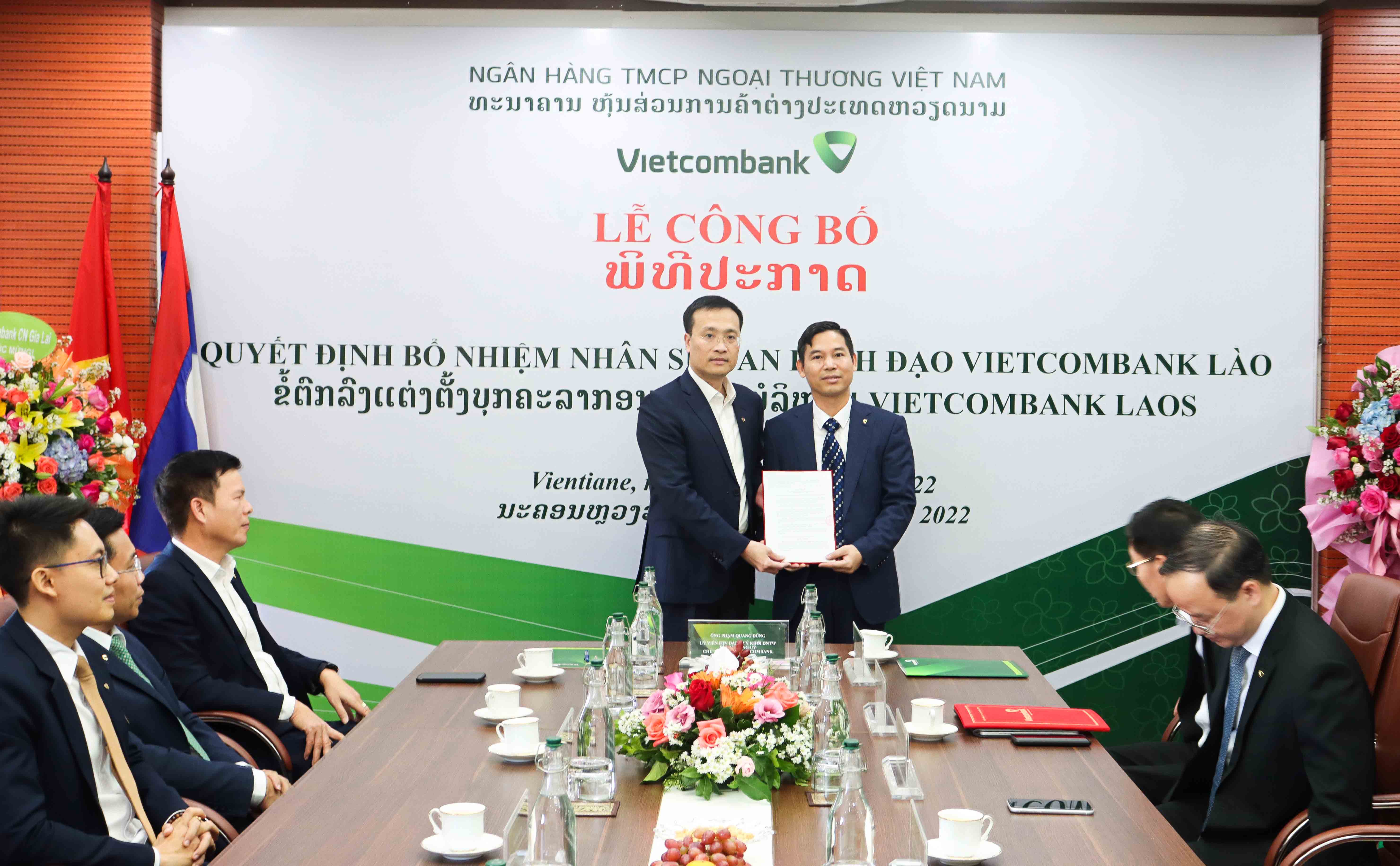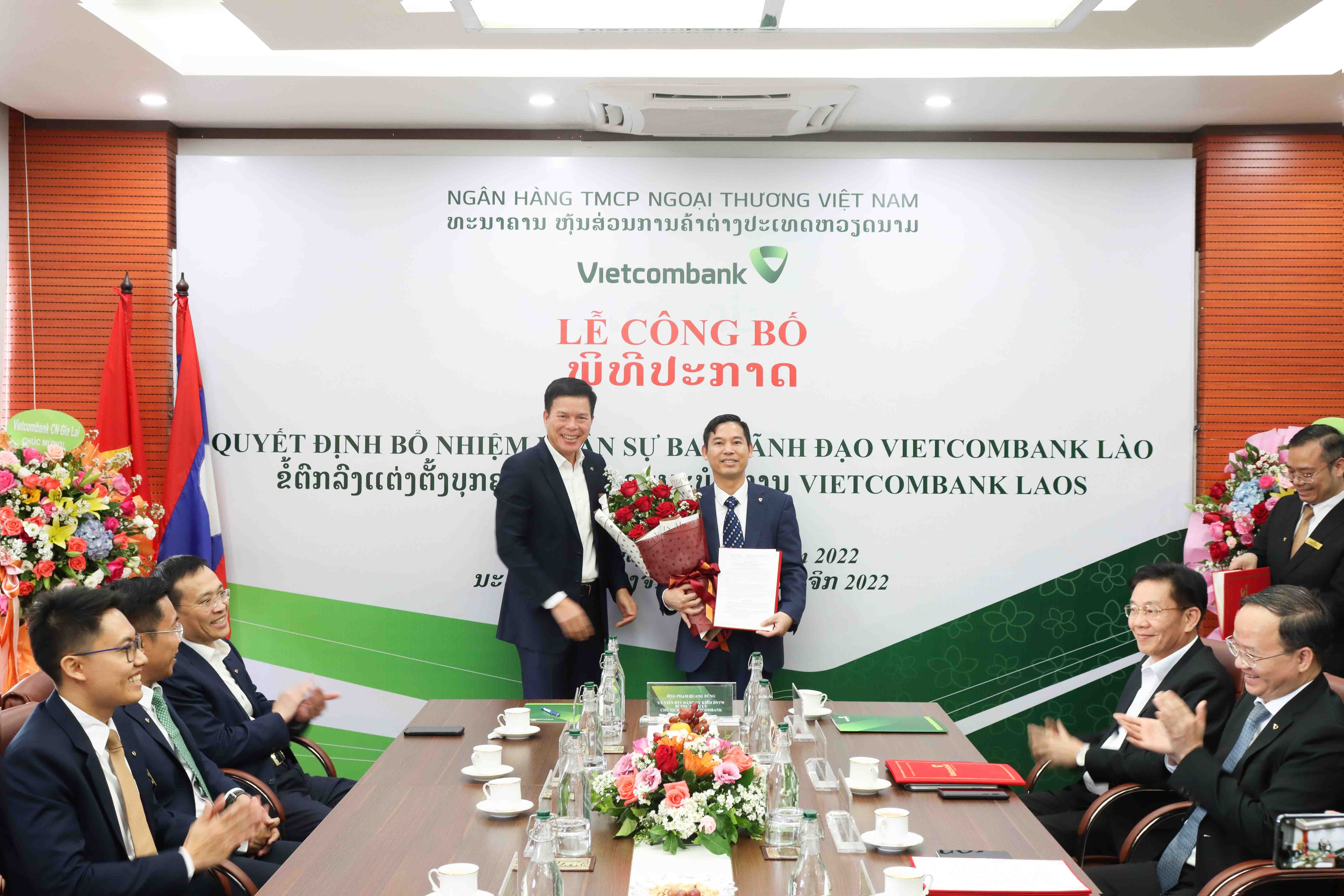 Tại buổi lễ, Vietcombank đã công bố các quyết định của Chủ tịch HĐQT về nhân sự Ban lãnh đạo VCB Lào, cụ thể: Cử ông Lê Quang Vinh - Phó Tổng giám đốc Vietcombank là người đại diện đầu mối phần vốn góp của Vietcombank tại VCB Lào và bổ nhiệm giữ chức vụ Chủ tịch HĐQT VCB Lào kể từ ngày 04/11/2022; Cử biệt phái ông Nguyễn Quang Minh - Phó Giám đốc Vietcombank Hoàng Mai là người đại diện phần vốn góp của Vietcombank tại VCB Lào và bổ nhiệm giữ chức vụ Thành viên HĐQT VCB Lào kể từ ngày 04/11/2022.