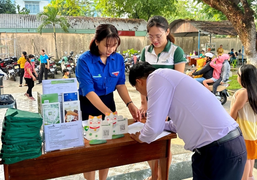 Đoàn viên ĐCS Vietcombank Bắc Bình Dương hướng dẫn khách hàng mở tài khoản tại gian hàng