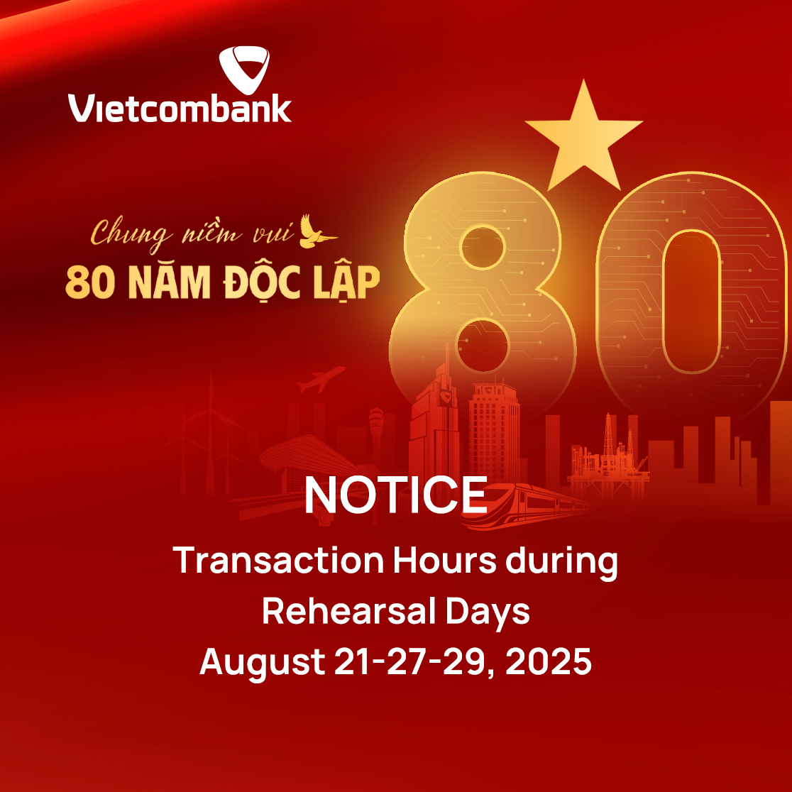 In accordance with the announcement by the Hanoi Police on complete traffic restrictions (except for authorized vehicles and vehicles serving the celebration) in August 2025 to facilitate traffic diversion for the 80th Anniversary of the August Revolution and National Day on September 2, Vietcombank hereby announces the adjustment of cash transaction hours at certain transaction offices as follows: