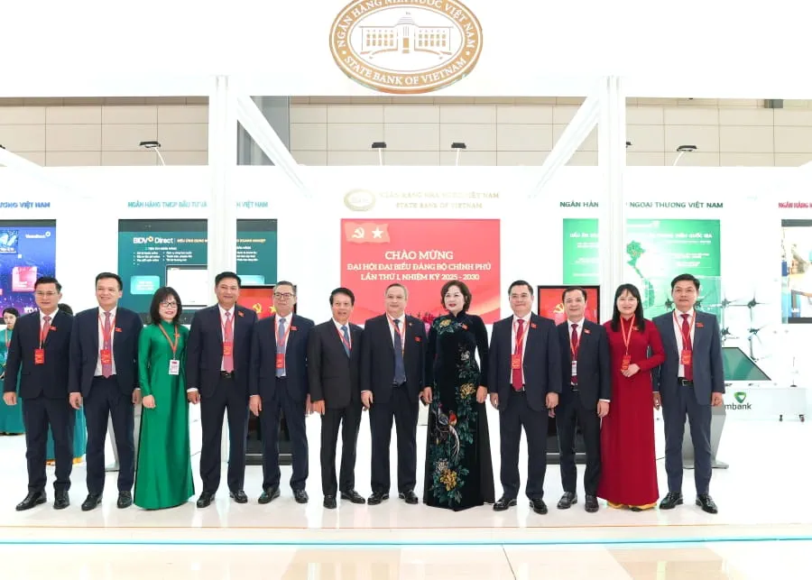 Governor of the State Bank of Vietnam Nguyễn Thị Hồng (5th from the right) took a photo with leaders of commercial banks at the banking sector exhibition space within the Congress framework