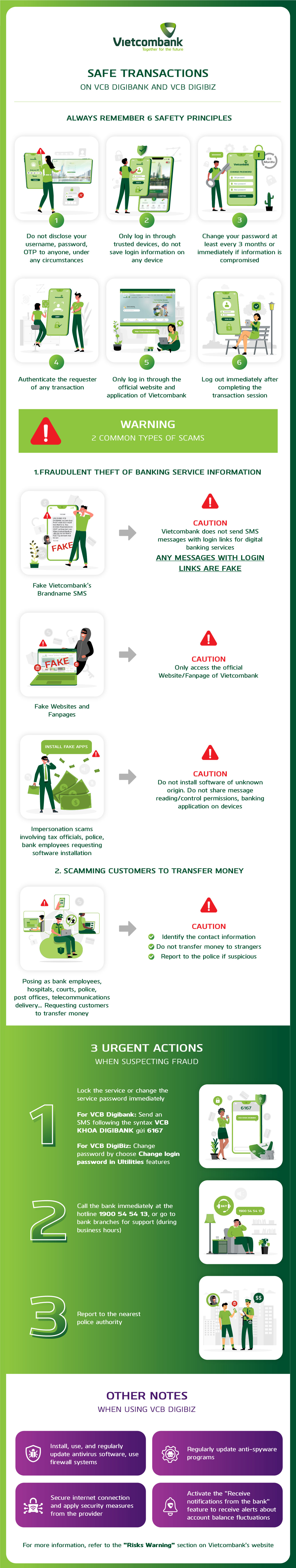 To stay safe when transacting online on VCB Digibank and VCB DigiBiz, please always follow Vietcombank's safe transaction guidelines below: