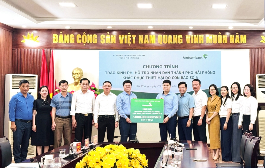 A representative from Vietcombank gave a support of VND1 billion through Fatherland Front of Hai Phong City